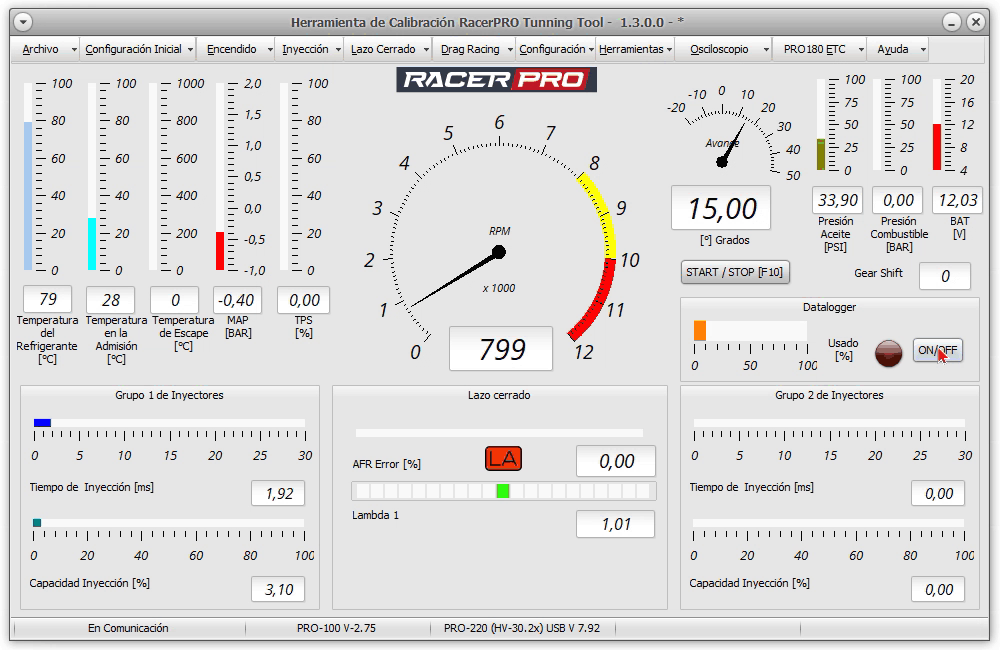 Si estamos haciendo ajustes desde nuestro software, podemos iniciar o detener el registro de información desde la pantalla principal, en la sección del Datalogger. En esta misma sección podemos ver, además, que porcentaje de la memoria está ocupada con información.